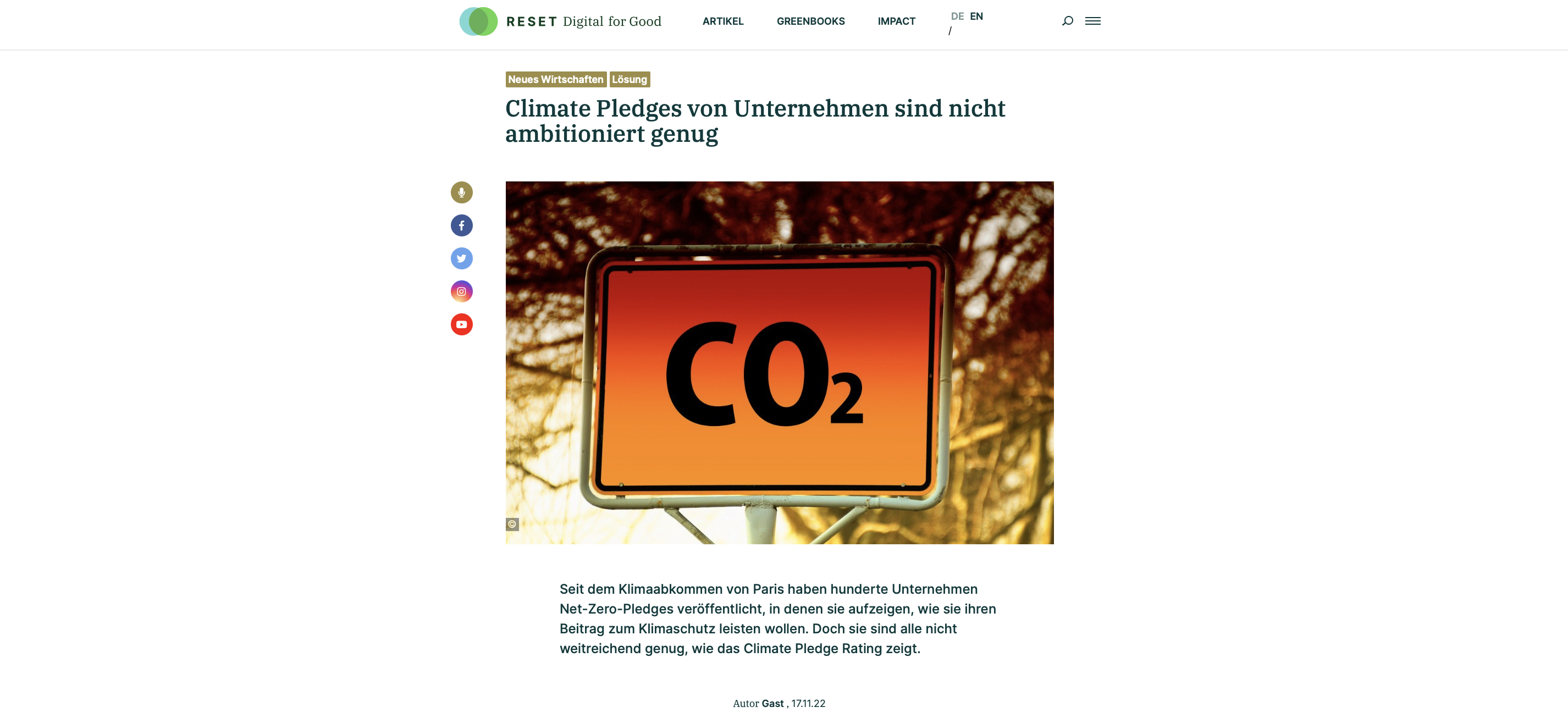 Seit dem Klimaabkommen von Paris haben hunderte Unternehmen Net-Zero-Pledges veröffentlicht, in denen sie aufzeigen, wie sie ihren Beitrag zum Klimaschutz leisten wollen. Um Versprechungen transparent zu machen, hat die TU Berlin gemeinsam mit der Suchmaschine Ecosia das Climate Pledge Rating entwickelt. Marja Lena Hoffmann und Maike Gossen berichten in dem Gastbeitrag bei RESET – Digital for Good darüber, dass Net-Zero-Pledges nicht weitreichend genug sind und wie das das Climate Pledge Rating zeigt.